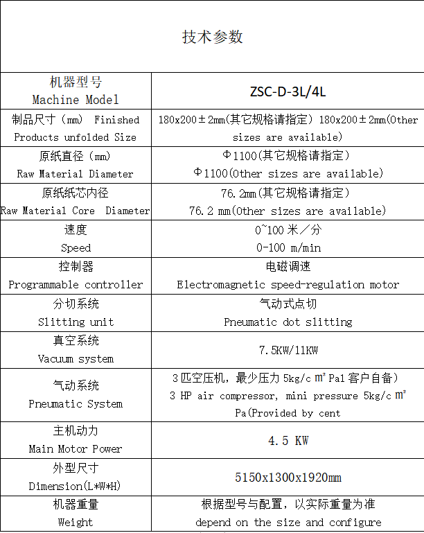 ZSC-D-3L/4L型抽式面巾纸机是将分切后的原纸经刀辊剪切,交互折叠成链式的长方形面巾纸。本机采用真空吸附、自动分叠计数功能,具有速度高、折叠整齐、操作简便等优点。