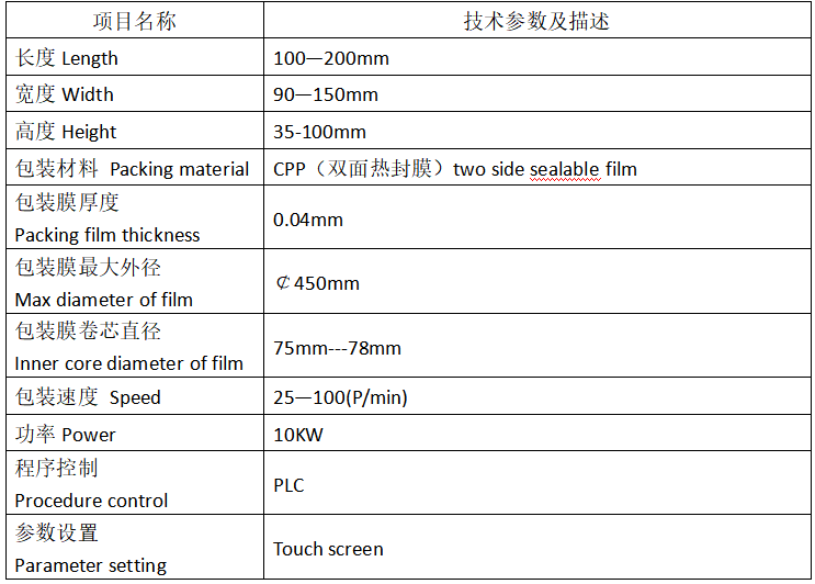 1.采用裹包、折边、封边的包装形式,结构紧凑、美观,适合于作为密封性要求不高的纸巾 纸盒等较规则四方体物件的外包装。 2.采用变频无级调速控制系统,触摸屏及PLC控制系统。人机界面显示更清晰,维护更简便。 3.采用自动理料输送尾架,方便与自动生产线连接,节约劳动力成本更明显。 4.双变频无级调速,包装速度、袋长任意调节。 5.自动化程度高、专业性强、生产效率高、故障率低。 6.包装范围大,各种规格尺寸之间可实现快速转换。