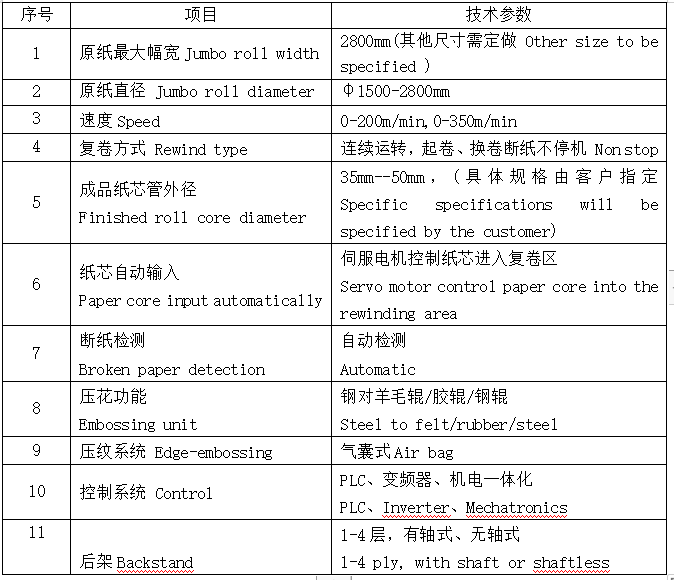 功能配置: 1.本机属于不停机,可连续生产; 2.整机采用西门子系统控制,自动化程度高,操作方便; 3.各单元采用独立电机或伺服电机控制,运行准确; 4.各复卷辊及刀辊采用高精度数控加工,保证机器运行稳定; 5.采用PLC编程控制,大屏幕人机界面操作,机光电一体化控制等国际先进技术,能自动检测并调整生产线的每个动作; 6.可选配压花部分、上胶复合部分、纸芯输送部分等。
