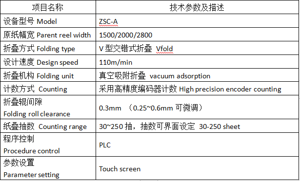 设备主要参数: 1.核心技术已取得多项国家专利; 2.生产速度100米/分,分叠10条/分; 3.自动化程度高,省人工,分纸整齐; 4.PLC控制的伺服系统完成自动分叠; 5.自动设定分叠抽数,精度100%准确;